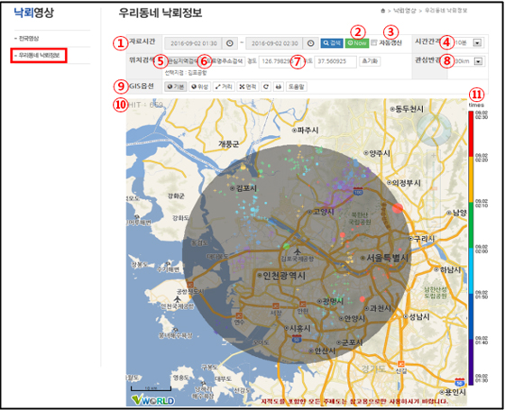 서비스는 사용자가 관심 영역을 설정하면 그 영역에 낙뢰 발생 빈도와 접근 위치 등을 실시간으로 확인할 수 있다.