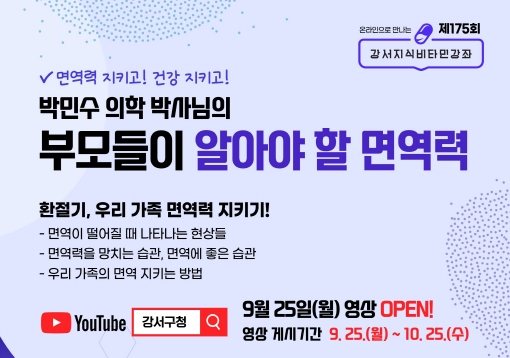 서울 강서구는 환절기를 맞아 가족의 건강을 지킬 수 있는 올바른 습관을 알아보는 제175회 강서지식비타민강좌 ‘박민수 의학 박사님의 부모들이 알아야 할 면역력’을 진행한다고 밝혔다.