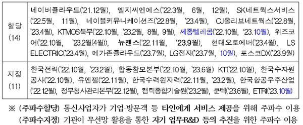 한편 LG전자와 세종텔레콤은 기존에도 이음5G 주파수할당을 받은 사업자로, 이번 할당으로 이음5G 서비스 구역 신규 3곳이 추가된다.