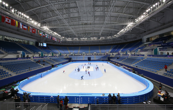 | 14일 개관한 2018 평창동계올림픽 피겨·쇼트트랙 경기장인 강릉 아이스아레나에서 국가대표 쇼트트랙 선수들이 훈련하고 있다. 강릉 아이스아레나는 지하 2층, 지상 4층, 건물 전체면적 3만2399㎡ 규모다. |