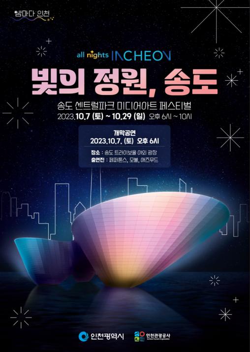 [일간환경연합 한선미 기자] 인천광역시와 인천관광공사는 송도 센트럴파크의 야경을 화려하게 수놓을 `빛의 정원, 송도(all nights INCHEON 페스티벌)`을 10월 7일 오후 6시 트라이보울 야외광장에서 펼쳐질 가을밤 음악공연을 시작으로 선보인다고 밝혔다. 이번 행사는 10월 7일부터 10월 29일, 오후 6시부터 10시까지 이어진다.