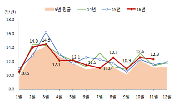 [일간환경연합 장민주 기자]국토교통부는 11월 전월세거래량이 12만 3045건으로 작년 11월보다는 6.9% 늘고 올해 10월보다는 2.0% 감소했다고 15일 밝혔다.