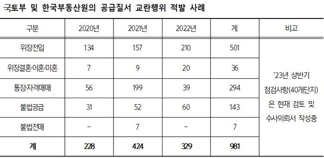 12일 국회 국토교통위원회 더불어민주당 장철민 의원(대전 동구)이 국토교통부로부터 제출받은 자료에 따르면, 부정청약 사례가 2020년부터 2022년까지 총 981건이 적발된 것으로 나타났다.