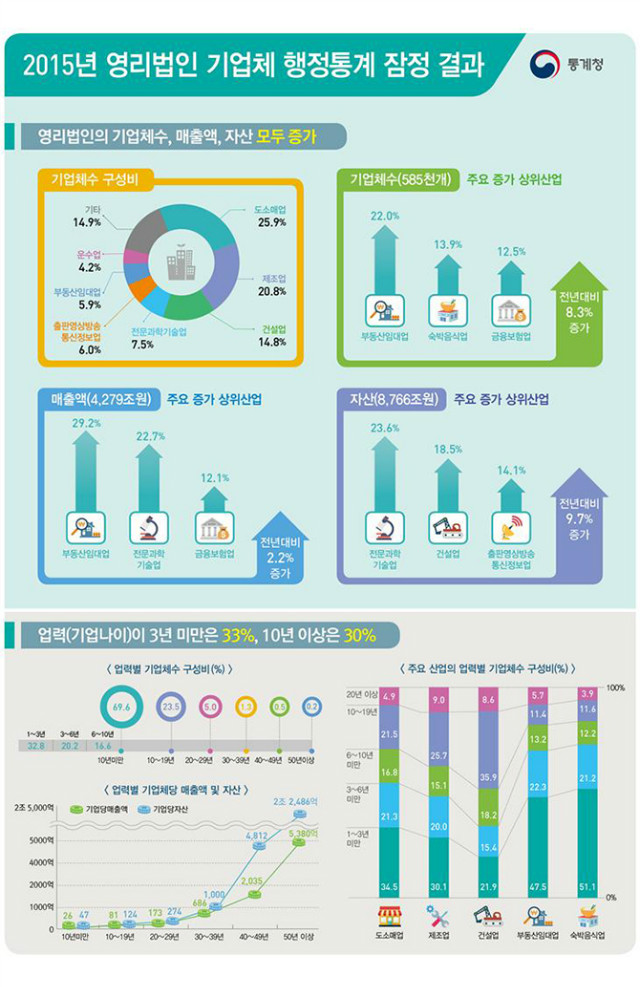 [일간환경연합 한선미 기자]통계청 ‘영리법인 기업체 행정통계’에 따르면, 2015년 기준 국내의 영리법인 기업체 수는 총 58만 5,000개로 도소매업·제조업·건설업이 61.5%를 차지합니다.