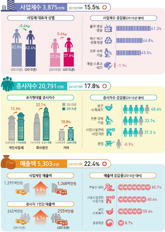 2015년말 기준 전체 종사자수는 2079만 1000명으로 2010년(1764만7000명)보다 17.8% 늘어난 것으로 조사됐다. 연평균 3.3%씩 증가한 셈이다.