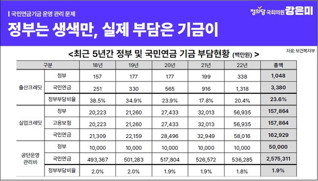 먼저 강은미 의원은 “국민연금 기금 고갈 위기”라고 하면서, “가입자에게는 보험료 내라고 하는데 국가는 내야 할 돈은 안내고 있다”고 지적했다. 출산이라는 사회적 기여에 대한 출산크레딧도, 18년에는 2억 5천만원 부담했지만 22년에는 13억 까지 부담하고 있다. 사회안전망인 실업크레딧도 기금에서 18년에는 213억 정도 부담하다 22년에는 580억을 부담하고 있다.