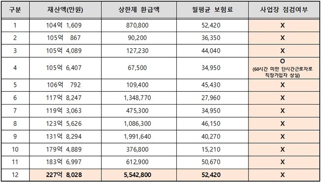 재산 규모별로는 ▲30~50억원 258명 ▲50~100억원 66명이었으며, ▲100억원 이상도 12명이나 있었고, 월평균 건보료는 1만5천원에서 5만원가량, 최고 자산가는 227억 소유자였다.