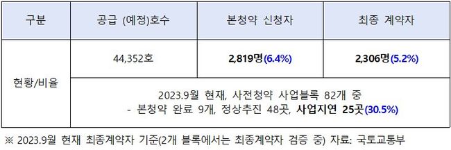 올해 9월 기준, 3기 신도시 등 공공아파트 사전청약이 시행된 총 82개 사업블록 중 25곳(30.5%)이 사업 지연 중이며, 정상추진 48곳, 본청약 완료 9곳이다. 사전청약 시행 사업장 10곳 중 3곳은 사업 추진이 지연되고 있는 셈이다.