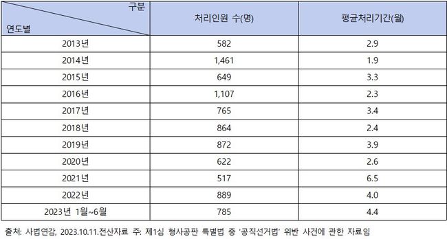반면, 일반인의 경우 공직선거법 위반 관련해 검찰이 기소한 날로부터 1심 선고까지 평균 소요 기간이 최근 10년간(2013년~2022년) 약 100일인 것으로 나타났다. 제20대와 제21대 전ㆍ현직 국회의원의 경우 공직선거법 위반 1심 선고 평균 기간은 164.4일이고, 제20대 국회의원의 중 1심 선고가 45일 만에 내려진 사건도 있는 것으로 밝혀졌다.