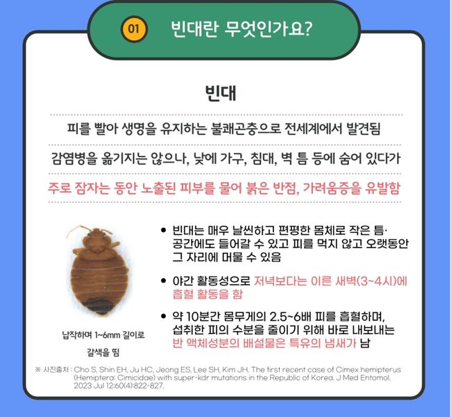 빈대는 감염병을 매개하는 해충은 아니지만 흡혈로 불편과 알레르기, 심리적 피로감을 주는 해충이다.
