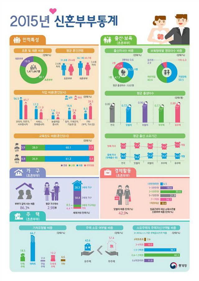 [일간환경연합 신상미 기자]2015년 11월 1일 기준 최근 5년 이내 혼인한 신혼부부는 총 147만 2천 쌍이며, 자녀를 출산하지 않은 신혼부부 비중은 전체의 35.5%를 차지했습니다.