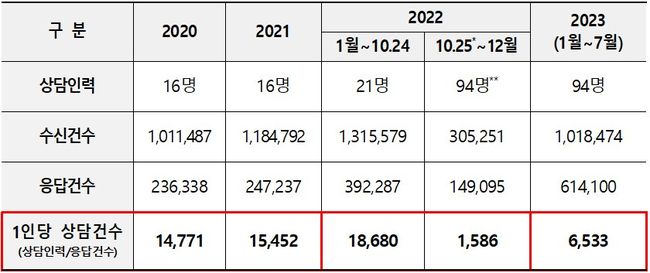 ‘전세반환보증금 보증’상담업무가 급증하자 HUG는 2022년부터 상담인원을 21명으로 확대하는 한편 민간위탁 상담원 73명을 추가해 총 94명의 상담인력을 운용하고 있으나 23년 7월 현재 1인당 상담건수는 6,533건으로, 추세대로라면 1만건을 상회해 업무과중 지적은 계속될 것으로 보인다.
