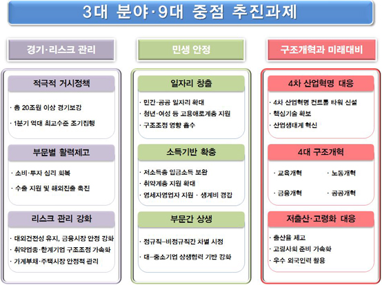 정부는 2017년 경제정책 방향을 거시경제를 안정적으로 관리하는 가운데 민생여건을 개선하고 4차 산업혁명과 저출산 고령화 등에 선제적으로 대비하는데 초점을 맞추고 3대분야(▲경제 리스크 관리 ▲민생안정 ▲구조개혁과 미래대비)·9대 중점 추진과제를 만들었다.