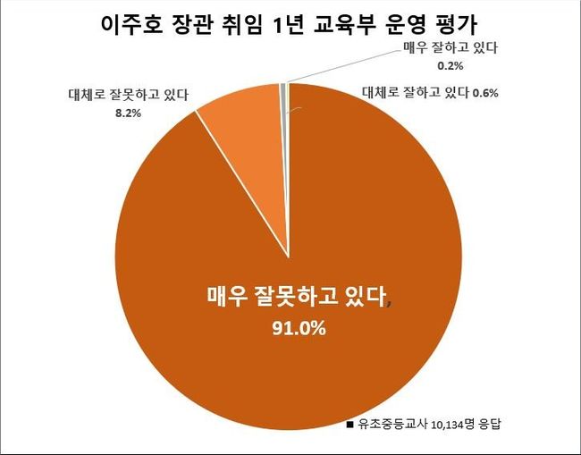 이 장관의 교육부 운영 평가에 관한 질문에서 응답자의 91%는 ‘매우 잘못하고 있다’를 선택했다. `대체로 잘못하고 있다`(8.2%)를 포함하면 부정 평가는 99.2%에 달한다. 반면 긍정 평가는 0.8%(`대체로 잘하고 있다` 0.6%, `매우 잘하고 있다` 0.2%)에 불과했다.