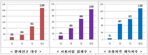 특히 드론 사업범위 확대, 소형 드론 사용사업 자본금 면제 등 항공법 시행규칙 개정 이후 5개월 동안 신고 등록된 드론과 사용사업 업체수가 현격히 증가했다.