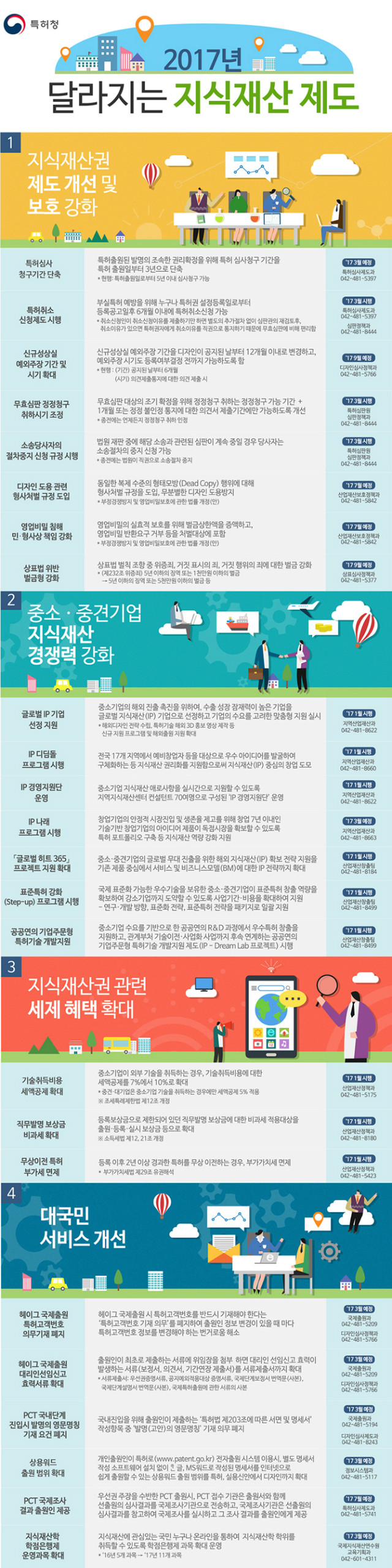 [일간환경연합 장민주기자]다음은 2017년 새롭게 달라지는 지식재산 제도 지원 시책입니다. 인포그래픽으로 한눈에 보겠습니다.