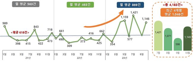 최근 3년간(`21.1월~`23.10월) 월별 민원 추이