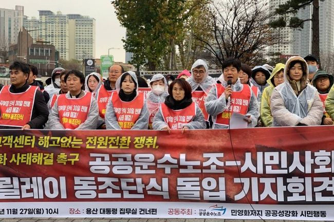 [일간환경연합 김경훈 기자] 공공운수노조 건강보험고객센터지부 파업과 지부장 단식이 27일 차에 접어든 가운데, 2021년 10월21일 합의된 정규직 전환 방식에 따른 고용안정과 처우개선을 촉구하는 노조와 시민사회의 기자회견이 11월27일 10시 용산 대통령 집무실 건너편에서 진행됐다.