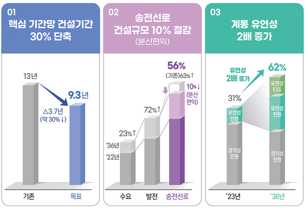 이에 전력의 동맥이라 할 수 있는 송전선로 건설 기간을 평균 13년(345kV 기준)에서 9.3년으로 30% 단축하고, 에너지저장장치(ESS) 등 출력조절이 가능한 유연화 전원의 비중을 2036년까지 62%로 2배 확대한다.