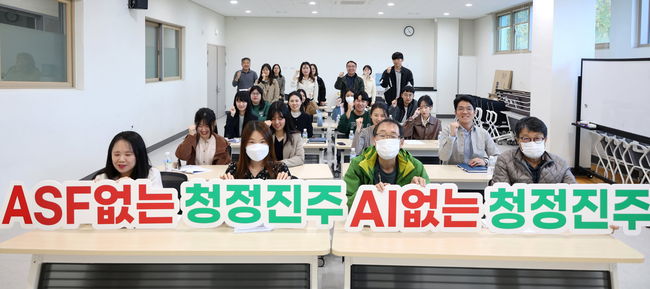 가축방역 담당 공무원들이 `ASF 없는 청정진주, AI 없는 청정진주` 구호를 외치고 있다.