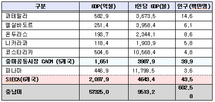 중미 6개국은 중남미에서 GDP 규모 5위(2098억달러), 인구 규모 3위(4350만명)으로 향후 성장 잠재력이 매우 큰 시장으로 한·중미 자유무역협정은 중미 6개국이 아시아 국가와 체결하는 최초의 자유무역협정으로써 타결시 중미 시장 선점의 중요한 계기가 될 것으로 예상된다.