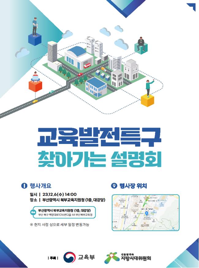 [일간환경연합 장민주 기자] 부산시는 오늘 오후 2시 부산북부교육지원청 대강당에서 교육부 주관 `교육발전특구 찾아가는 설명회`가 열린다고 밝혔다.