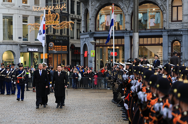 ▲ 윤석열 대통령이 12일(현지시간) 네덜란드 암스테르담 담 광장에서 열린 국빈 방문 공식 환영식에서 빌렘-알렉산더 네덜란드 국왕의 안내로 의장대를 사열하고 있다. (사진=대통령실) [일간환경연합 장영기 기자]1961년 수교를 맺은 한국과 네덜란드는 윤석열 대통령의 국빈방문을 계기로, 외교-산업 2+2 장관급 대화체를 신설하고 반도체, 경제, 에너지, 국방·안보, 문화·인적교류 등 광범위한 미래지향적 협력의 발전을 이뤄나가기로 했다.