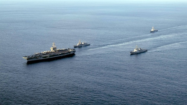 ▲ 한미 해군과 일본해상자위대가 지난달 26일 제주 동남방 공해상에서 북한의 핵·미사일 위협이 고도화되는 상황에서 한미일간의 긴밀한 공조와 작전수행능력 강화를 위한 해상훈련을 하고 있는 모습. 앞줄 왼쪽부터 미 해군 항공모함 칼빈슨함, 일본 해상자위대 구축함 키리사메함, 한국 해군 이지스구축함 세종대왕함, 미 해군 이지스구축함 키드함. (사진=미 해군)또 3국은 내년부터 시행될 다년간의 3자 훈련 계획을 수립했다.