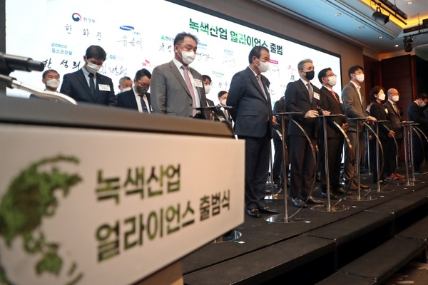 ▲ 올해 초 열린 녹색산업 협의체(얼라이언스)의 출범식 모습.(ⓒ뉴스1) 이번 성과는 산업계와 환경부가 원팀(One-Team)으로 협력해 노력한 결과이며, 이달 말까지 수주를 추진 중인 사업과 실적에 반영되지 못한 이달 녹색제품 수출실적을 반영하면 올해 녹색산업 수주·수출 전체 실적은 최대 21조 5662억 원에 달할 것으로 보인다.
