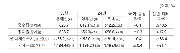 ▲ 2024년도 재정운용 모습. (사진=기획재정부)내년도 예산안의 최대 쟁점이었던 연구개발(R&D)은 정부안보다 6000억 원 순증됐다. 새만금 관련 사회간접자본(SOC) 사업도 정부안에서 3000억 원 증액 편성됐다.