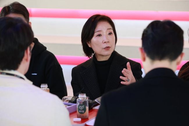오영주 중소벤처기업부 장관(왼쪽에서 두 번째)이 1일 서울 영등포구 소재 청년창업기업 ㈜티오더를 방문해 임직원들과 차담회를 진행하고 있다.