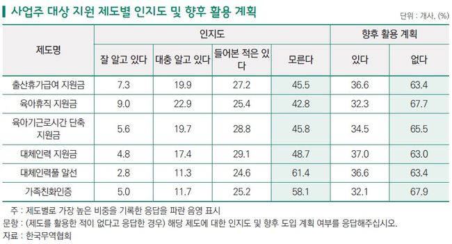 또한 출산휴가급여 지원금, 육아휴직 지원금, 육아기근로시간 단축 지원금, 대체인력 지원금, 대체 인력풀 알선, 가족친화인증 등 사업주 출산‧양육 지원제도를 활용한 적이 없다는 기업은 60.5%에 달했으며, 응답 기업 절반(50.4%)은 해당 제도를 몰랐다고 응답했다.
