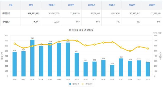 2023년 수주 실적과 관련 상세정보는 해외건설협회에서 운영하는 해외건설통합정보서비스를 통해 확인이 가능하다.