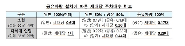 주차장 기준도 공유차량 주차면수 설치 시 1대당 일반 주차면수 3.5대를 적용하는 방식으로 완화한다.