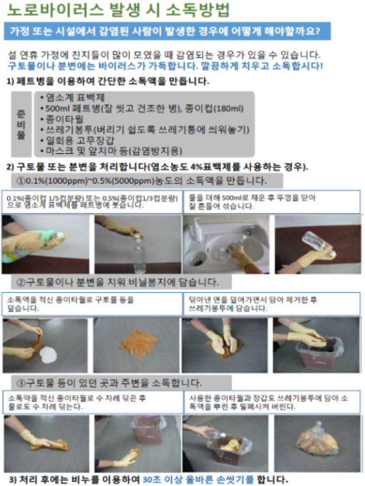 만약 가족 등이 음식물 섭취 24∼48시간 후 구토, 설사 등이 발생한 경우에는 병원에서 진료를 받도록 하고 오염된 물품, 화장실 등은 염소소독을 한 후 사용하는 것이 좋다.