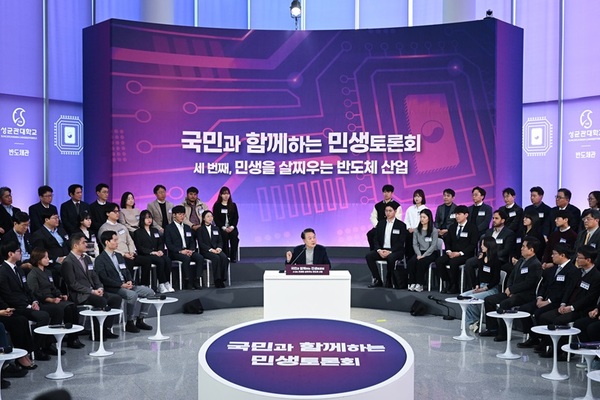 ▲ 윤석열 대통령이 15일 경기도 수원 장안구 성균관대 자연과학캠퍼스 반도체관에서 ‘민생을 살찌우는 반도체 산업’을 주제로 열린 세 번째 국민과 함께하는 민생토론회에서 발언하고 있다.(ⓒ뉴스1) ‘민생을 살찌우는 반도체 산업’을 주제로 열린 이날 토론회에는 지역주민과 반도체 업계 종사자·학생·연구자 등 110여명이 참석했다.