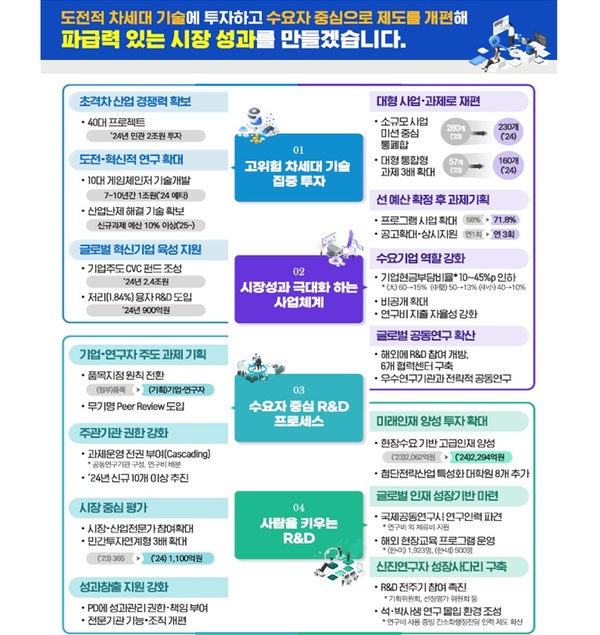 또한, R&D 프로세스를 수요자 중심으로 전환해 품목지정 방식을 전면 도입해 정부는 도전적 목표만 제시하고, 기업과 연구자가 과제기획을 주도한다.