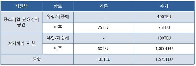 이번 지원대책을 통해 중소기업은 안정적으로 수출물량을 선박에 실을 수 있는 공간을 확보할 수 있게 되고, 장기계약 지원을 통해 운임 안정성도 보장받을 수 있게 될 예정이다.