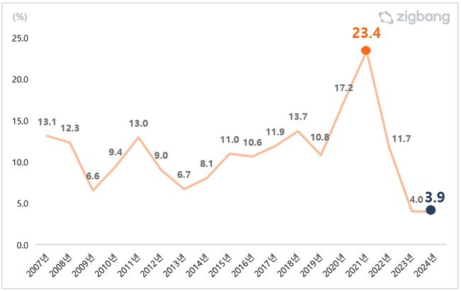 2024년 전국 아파트 매매 신고가 거래비율이 2006년 이후 역대 최저치인 3.9%를 기록했다. 지난해 역시 4%로 관련 수치는 저조했다.