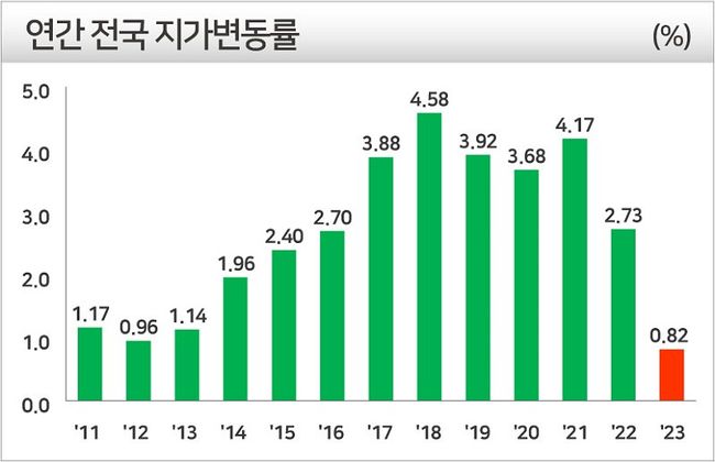이날 발표에 따르면, 2023년 전국 지가는 0.82% 상승하였다. 상승폭은 `22년(2.73%) 대비 1.91%p, `21년(4.17%) 대비 3.35%p 축소된 것으로 나타났다.