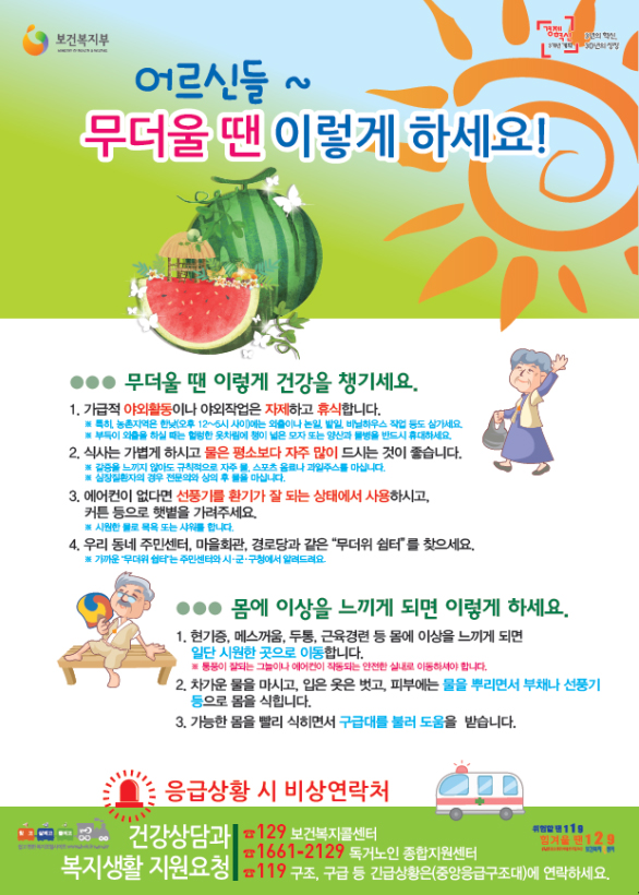 아울러 이 같은 폭염대응 행동 요령을 노인복지관 등에서 어르신들을 대상으로 교육하고 관련 포스터를 경로당·주민센터·노인복지관 등에 배포한다.