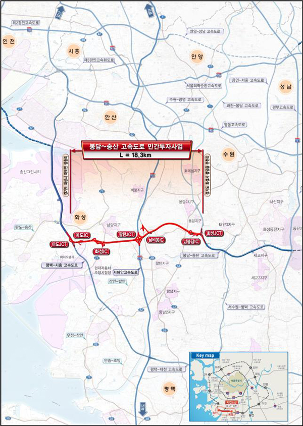 봉담~송산 고속도로는 한화건설 등 11개사로 구성된 경기동서순환도로에서 시행하는 민간투자사업으로 민간투자사업심의위원회의 심의를 거쳐 작년 6월 27일 실시협약이 체결된 바 있다.