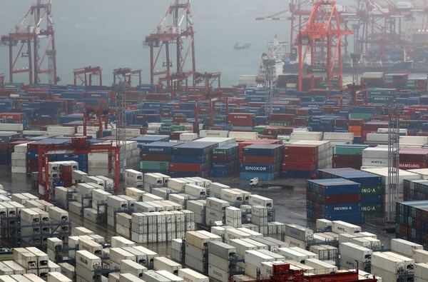 ▲ 부산항 신선대부두 야적장에 컨테이너가 가득 쌓여 있는 모습.(ⓒ뉴스1) 지난달 수입은 543억 9000만 달러로 7.8% 감소했다.