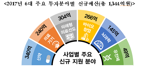 올해 미래부가 추진하는 바이오분야 원천기술개발사업의 예산은 2016년 대비 31.4% 증가한 3157억원으로 핵심원천기술 확보와 미래시장 창출을 위해 6대 주요 투자분야(신약, 의료기기, 미래형 의료선도, 바이오창업활성화, 유전체, 뇌과학 등)를 중점 지원하며, 올해에만 1344억원 규모로 신규과제를 선정한다.