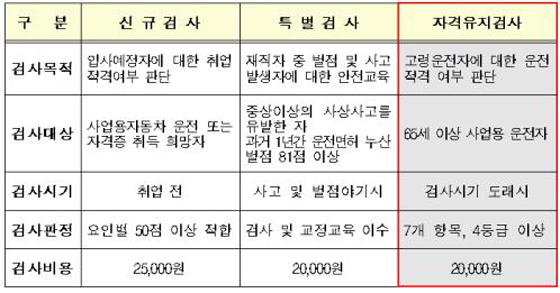 자격유지검사는 일정 주기(65세∼69세: 3년, 70세∼: 1년)마다 주의력 등을 알아보는 운전적성검사를 통해 자격유지 가능 여부를 판정한다.