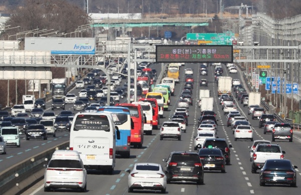 ▲ 지난해 설 연휴 마지막날인 1월 24일 오후 경기 오산시 경부고속도로 오산IC 인근 상하행선의 교통량이 많은 모습. (ⓒ뉴스1) 정부는 설 전후 4일간 모든 차량의 고속도로 통행료를 면제하고 철도·항공 짐배송 서비스, 출국장 조기운영 등 여행 편의를 제공한다.