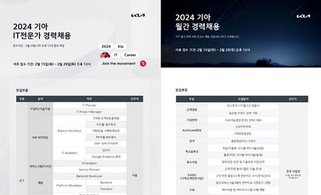 기아 관계자는 “글로벌 IT 서비스를 직접 설계하고 개발하는 경험은 개발자들의 성장과 경력에 많은 도움이 될 것”이라면서 “IT 부문과 함께 다양한 직무에서 경력직 채용을 통해 미래 모빌리티 시장의 경쟁력을 강화하고 신사업 전략의 과감한 전개를 도모하겠다”고 말했다.