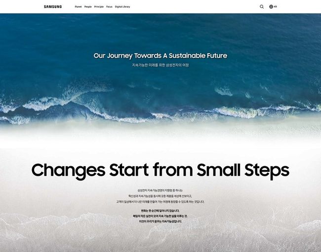 웹사이트 랜딩 페이지는 삼성전자의 지속가능경영 비전과 주요 활동을 일러스트와 인터렉션이 가미된 스토리텔링 방식으로 전달한다. 평가사∙투자자∙고객사 등 보다 깊이 있는 정보를 필요로 하는 이해관계자들을 위해 팝업 창을 통해 상세한 정보를 제공하며, 인터넷 주소(URL)도 쉽게 공유할 수 있도록 했다.