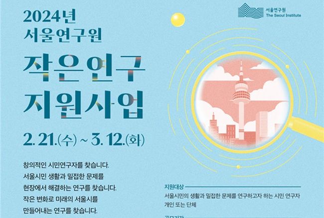서울연구원은 2월21일~3월12일 `2024년도 작은연구 지원사업`을 공모한다고 밝혔다.