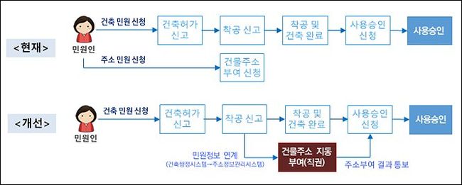 이를 위하여 행안부와 국토부가 함께 양 기관이 관리하는 주소정보관리시스템(행안부) 및 건축행정시스템(국토부)을 개선하여 민원정보(서류) 공동 활용 등 관련 기능을 올해 하반기까지 구축한다.